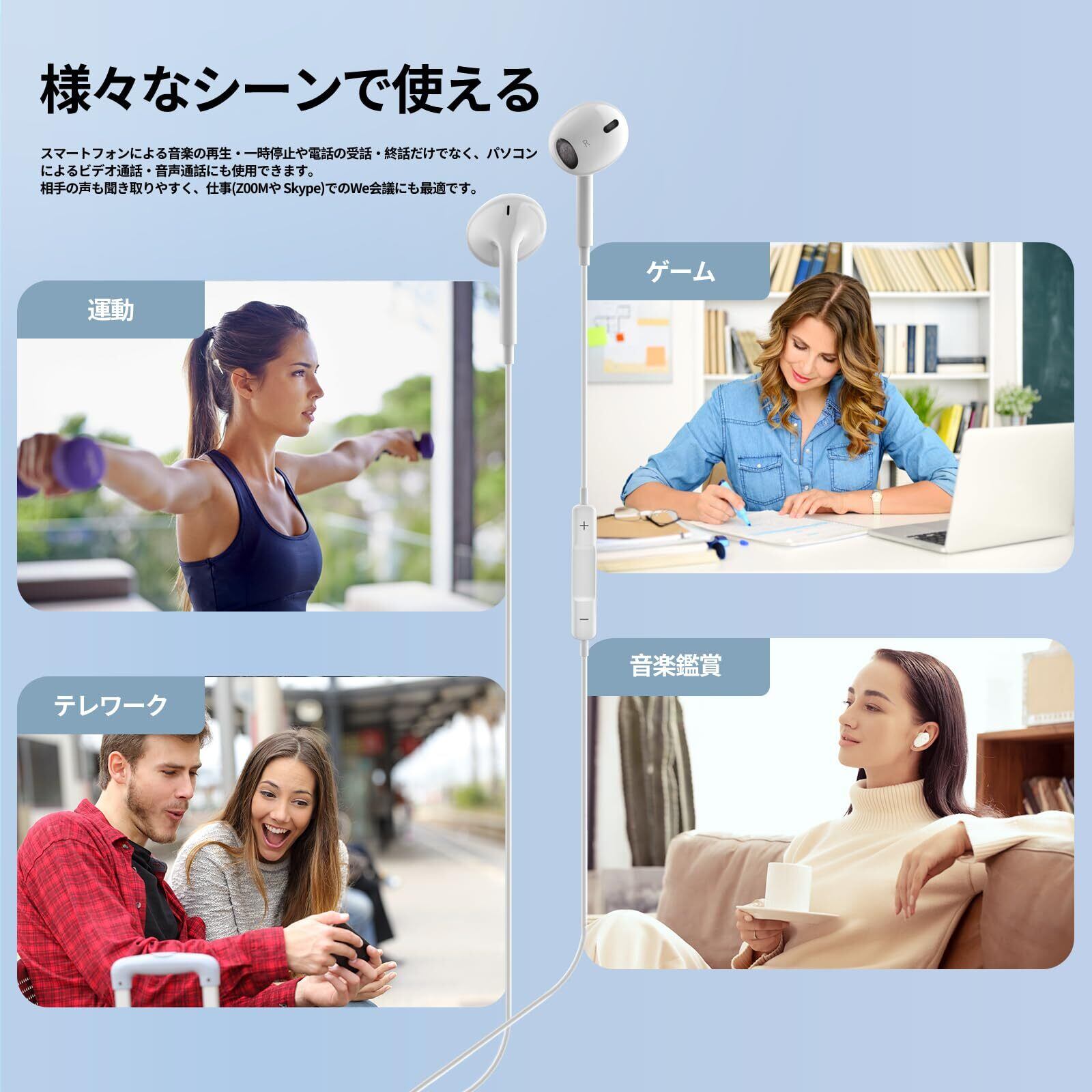 「イヤホンマイク」▶「便利」ケーブルにはリモコンとマイクを搭載。スマートフォンによる音楽の再生・一時停止や電話の受話・終話だけでなく、パソコンによるビデオ通話・ゲームにも利用できます。相手の声も聞き取りやすく、仕事(オンライン会議・テレワーク)接続してWet会議にも最適です。※ノートパソコンにはリモコンのボタンを対応しておりません。パソコン側に調整が必要になります。