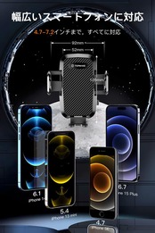 【全機種対応】スマホカーマウントは、幅52mm〜92mm、厚さ15mm未満のすべての携帯電話に適しています。使用中は、電話機の背面にあるカメラをブロックしたり、充電ポートやヘッドフォンジャックに影響を与えたりすることはありません。また、スマホに充電しながら車載ホルダーとしても使えるので、Google地図などの地図アプリケーションをナビゲーションとして使う時には電池の残量を心配せずに快適に運転できます。