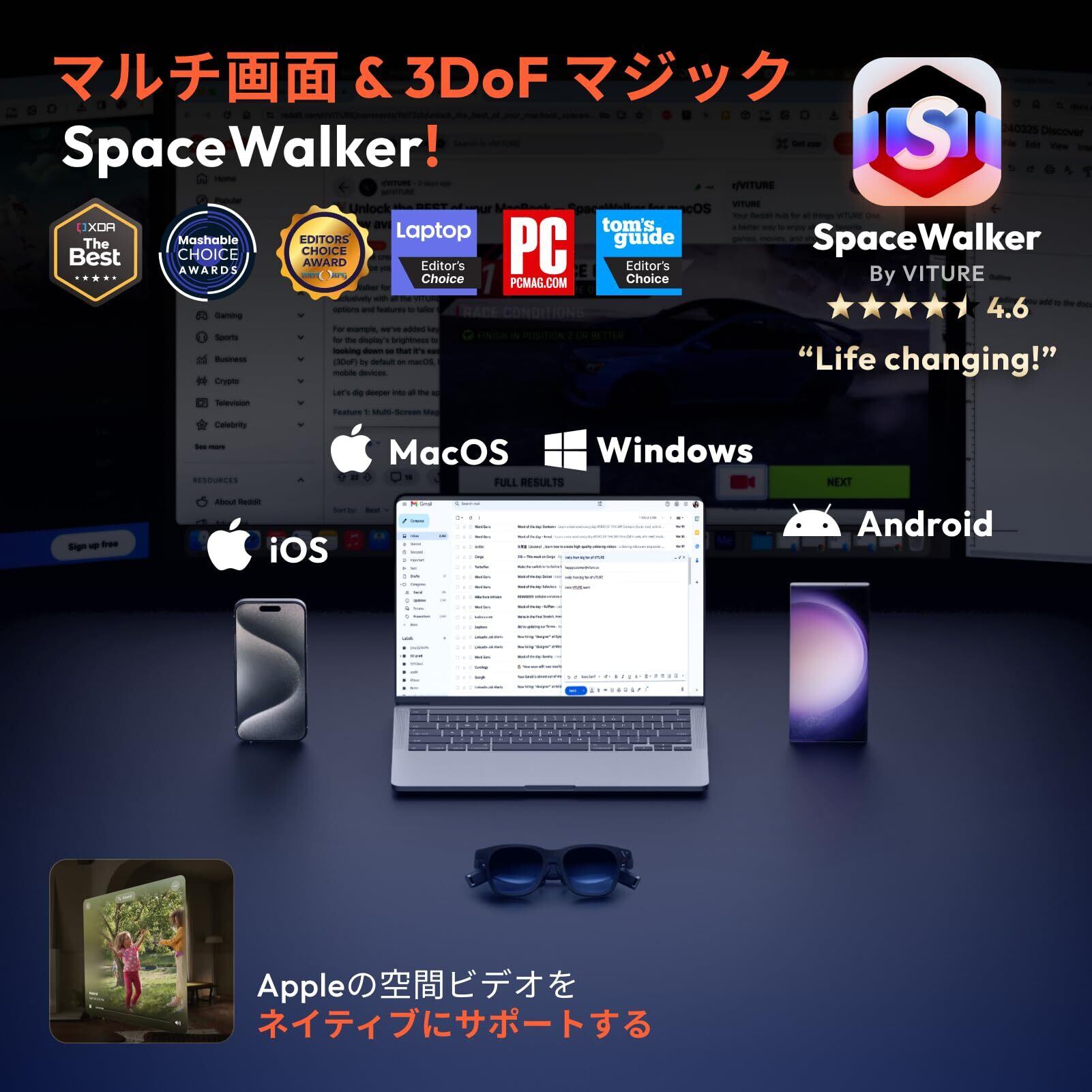 特徴 3DoF。, 空間ビデオ/空間写真。, 複数の画面。, VRビデオ。, 調節可能なエレクトロクロミックフィルム。